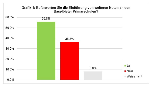 Die Resultate der durchgeführten Umfrage, bei welcher 786 Personen aus den beiden Basler Halbkantonen teilgenommen haben (davon rund 84.5% Lehrpersonen), sind bemerkenswert: 55.8% der Umfrageteilnehmenden spricht sich für Noten in weiteren Fächern aus, 36.3% sind dagegen. (siehe Grafik 1)