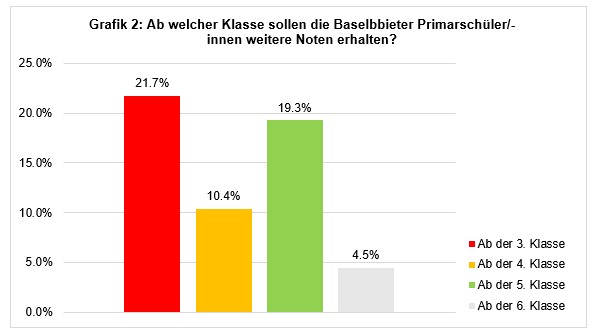 Die Umfrageteilnehmenden, welche in der ersten Frage die Einführung von weiteren Noten befürworteten, hatten in einer Folgefrage die Möglichkeit anzugeben, ab welcher Stufe die Schulkinder die zusätzlichen Noten erhalten sollten. (siehe Grafik 2)