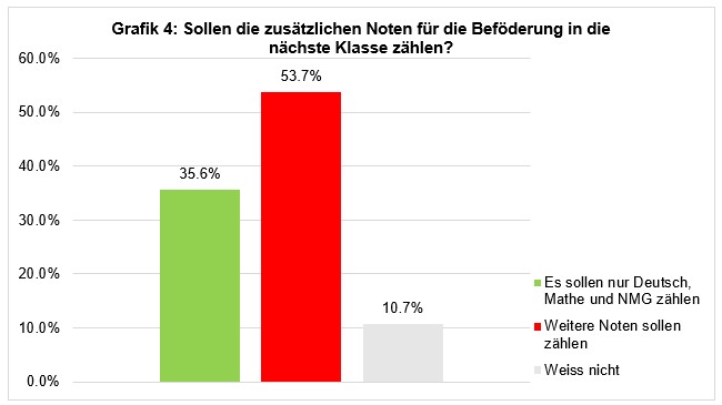 Die Umfrage stellte folglich die Frage, ob für die Beförderung in die nächste Klasse die zusätzlichen Noten auch zählen sollten oder ob für die Beförderung weiterhin nur die Noten in Deutsch, Mathematik und NMG entscheidend sein sollen. Auch hier sind die Resultate deutlich: 53.7% befürworten, dass weitere Noten für die Beförderung zählen sollten, 35,6% sind dagegen,10.7% sind sich bei dieser Frage unsicher. (siehe Grafik 4)