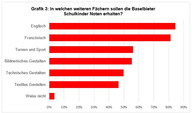 Die dritte Grafik bildet ab, in welchen weiteren Fächern Noten eingeführt werden sollen: Rund 80% der Umfrageteilnehmenden befürwortet Noten in Englisch und Französisch. Die weiteren Fächer erhielten Zustimmungswerte zwischen 45% und 56%, wobei Turnen und Sport diese Gruppe von Fächern anführt.