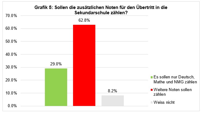 Dieselbe Frage konnten die Umfrageteilnehmenden in Bezug auf den Übertritt in die Sekundarschule beantworten. Dort fallen die Ergebnisse mit 62.8% Zustimmung sogar noch deutlicher aus. (siehe Grafik 5)