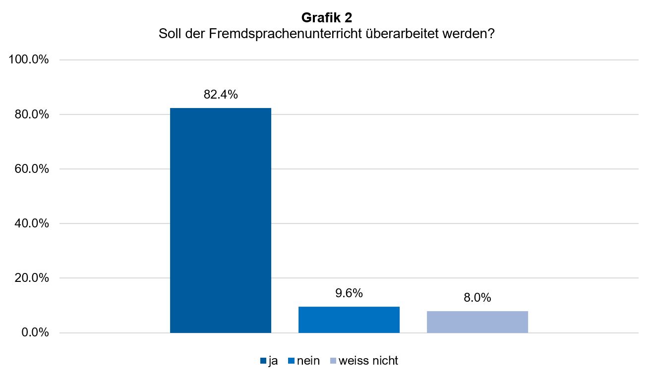 In der Umfrage wurden die Teilnehmenden auch gefragt, ob das Fremdsprachenkonzept der Primarstufe überarbeitet werden soll. Hier fallen die Antworten sogar noch deutlicher aus. Ganze 82.4% sprechen sich für eine Überarbeitung aus und nur 9.6% sehen dies nicht als notwendig. 7.9% antworteten mit «weiss nicht» (siehe Grafik 2).
