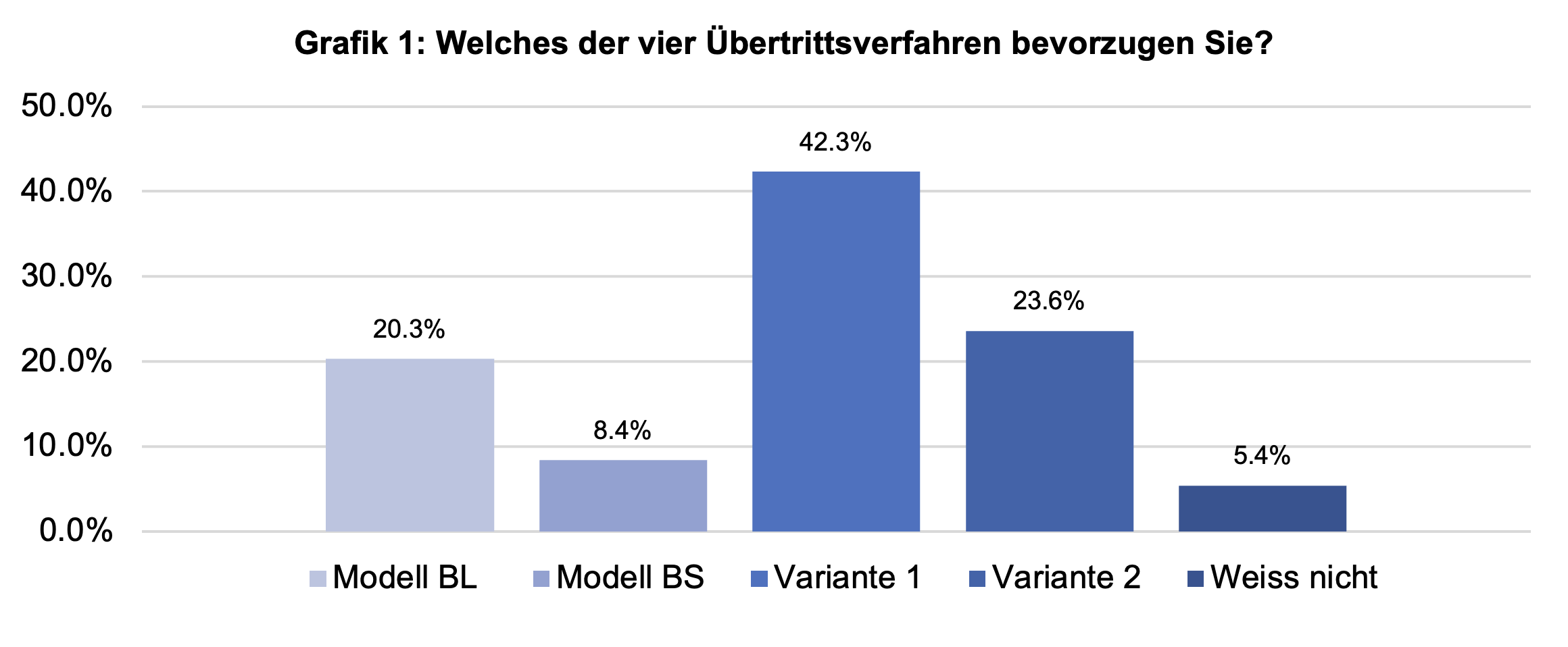 Bei der Frage, welches der vier genannten Übertrittsverfahren bevorzugt wird, schneidet die neu zur Diskussion gestellte Variante 1 mit 42.3% Stimmen deutlich am besten ab. An zweiter Stelle folgt mit 23.6% die neue Variante 2, dicht gefolgt vom aktuellen Übertrittsverfahren in Baselland, welches von 20.3% der Befragten favorisiert wird. An letzter Stelle liegt das Verfahren von Baselstadt, welches lediglich 8.4% der Stimmen erhielt (siehe Grafik 1).