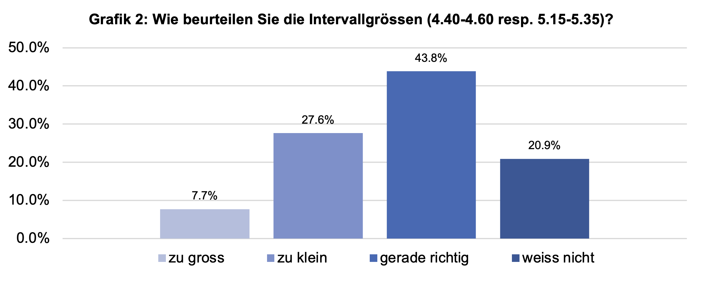 Die Niveauempfehlung der Klassenlehrperson kommt bei dieser Variante nur zum Tragen, wenn der Notenschnitt zwischen 4.40 – 4.60 (Spielraum zwischen A- und E-Niveau) respektive zwischen 5.15 -5.35 (Spielraum zwischen E- und P-Niveau) liegt. In der Umfrage gaben 43.8% der Befragten an, dass die beiden Intervallgrössen so richtig gewählt sind. 27.6% finden die vorgeschlagenen Intervallgrössen zu klein, 7.7% hingegen zu gross. 20.9% können oder möchten dazu keine Aussage machen (siehe Grafik 2).