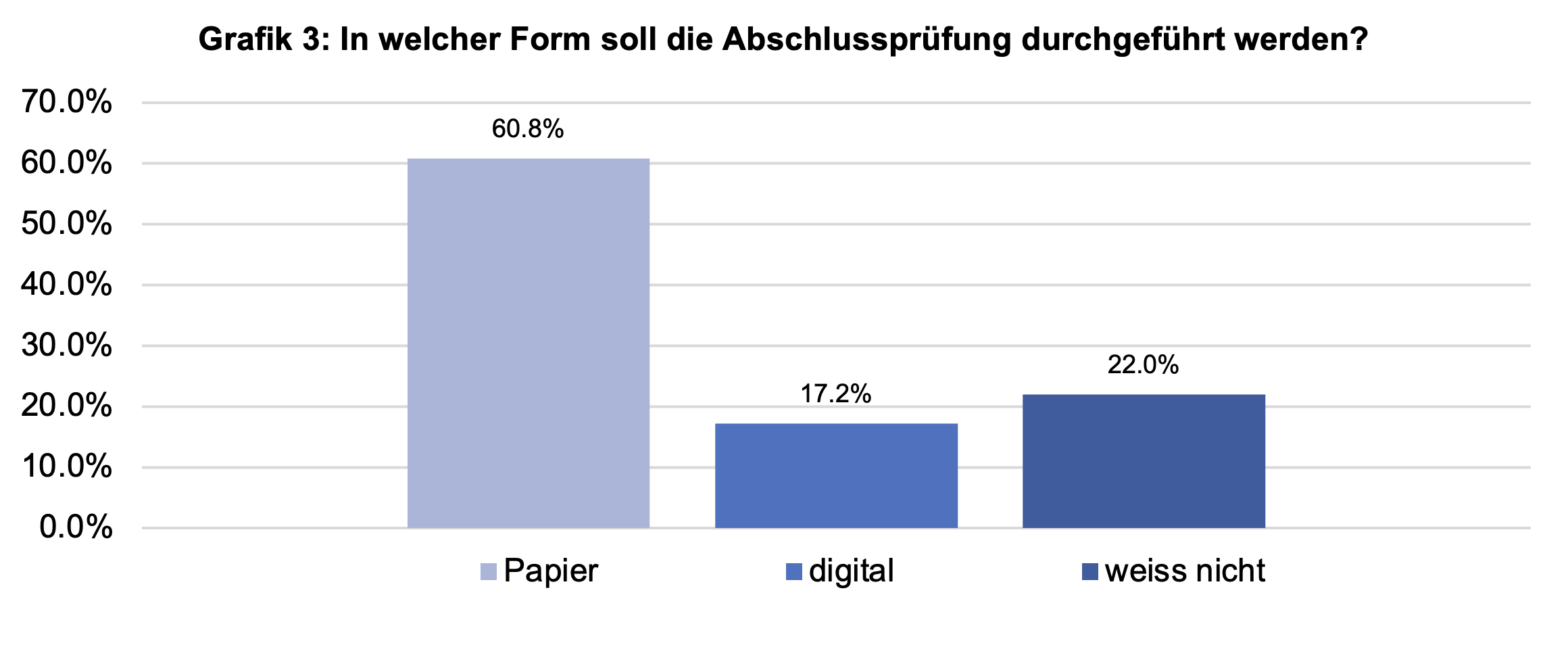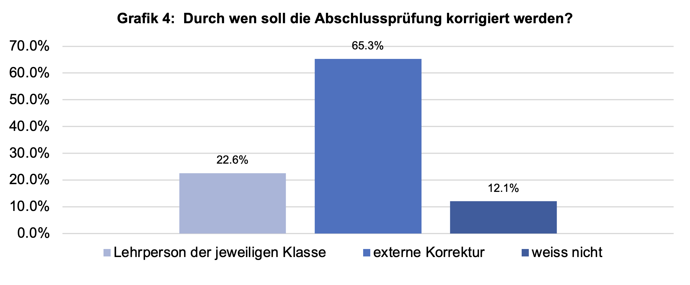 Die Umfrageteilnehmenden wurden gebeten, verschiedene Formen der Ausarbeitung einer solchen kantonalen Prüfung zu beurteilen. Die bevorzugte Variante der Befragten wäre demnach eine Prüfung auf Papier (siehe Grafik 3), welche von einer externen Stelle korrigiert wird (siehe Grafik 4), und die Note der Abschlussprüfung sowie die Noten in den letzten beiden Zeugnissen sollen mit je 33.3% gewichtet werden (siehe Grafik 5).