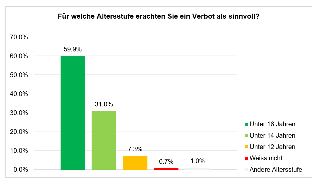 Auch die Resultate, für welches Alter ein Verbot gelten solle, sind eindeutig: 59.9% befürworten ein Verbot für unter 16-jährige, 31.0% ein solches für Jugendliche unter 14 Jahren. Die anderen Altersgruppen, zum Beispiel ein Verbot bis 12 Jahren, wurden kaum gewählt (siehe Grafik).