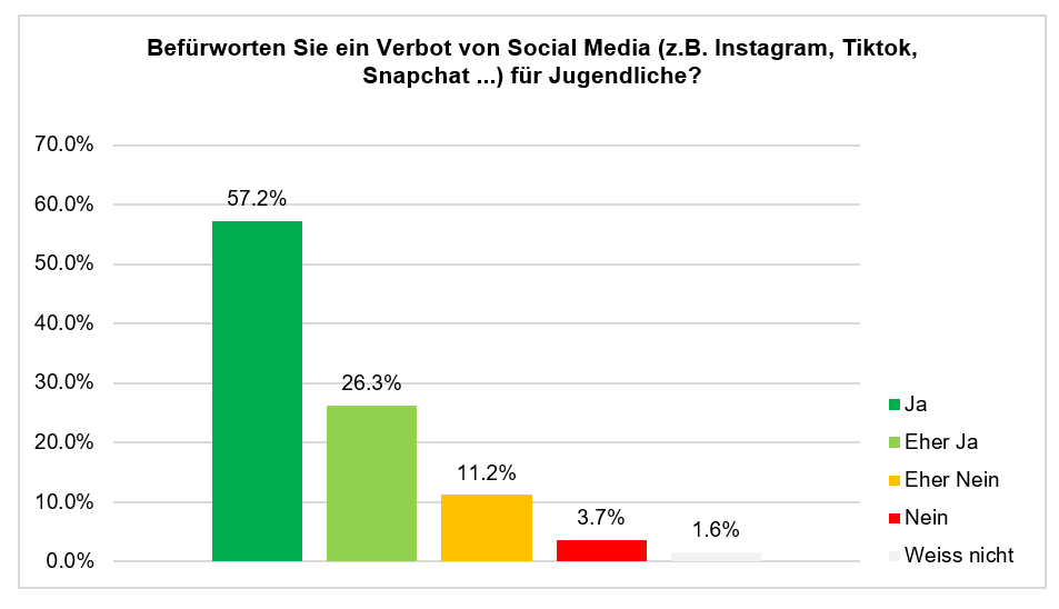 83.5% sprechen sich für ein Verbot von Instagram, Tiktok, Snapchat usw. für Jugendliche aus, lediglich 14.9% sind dagegen (siehe Grafik).