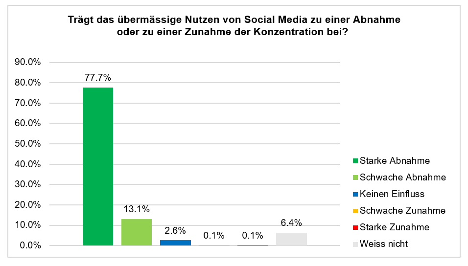 90.8% der Umfrageteilnehmenden gaben an, dass das übermässige Nutzen von Social Media zu einer Abnahme der Konzentration führt. Lediglich 2.6% ist der Ansicht, Social Media hätte keinen Einfluss auf die Konzentration (Grafik 3).