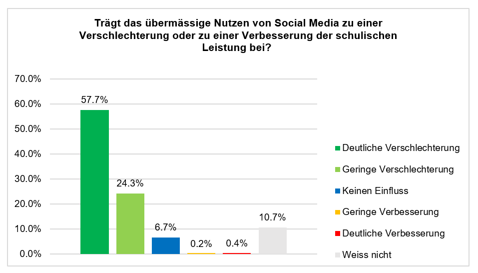 Auch die Resultate betreffend der Frage, ob die übermässige Nutzung von Social Media einen positiven oder negativen Einfluss auf die schulische Leistung habe, sind deutlich: Für 82.0% der Umfrageteilnehmenden nimmt die schulische Leistung aufgrund einer übermässigen Nutzung von Social Media ab (siehe Grafik).