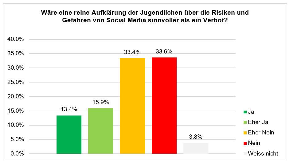 Rund 29.3% der Umfrageteilnehmenden würden eine fundierte Aufklärung über Risiken und Gefahren von Social Media bevorzugen, während 67.0% sich für ein klares Verbot aussprechen.